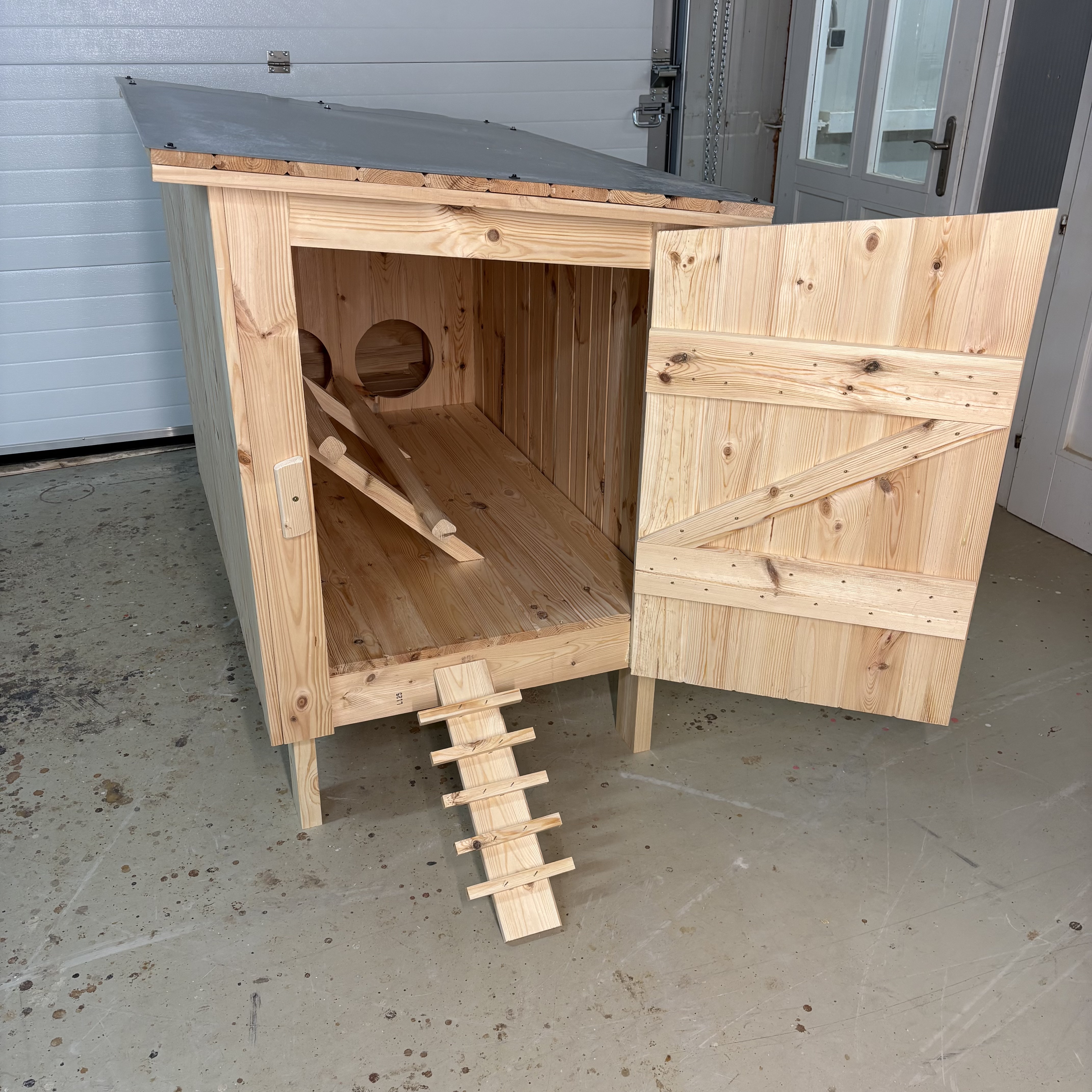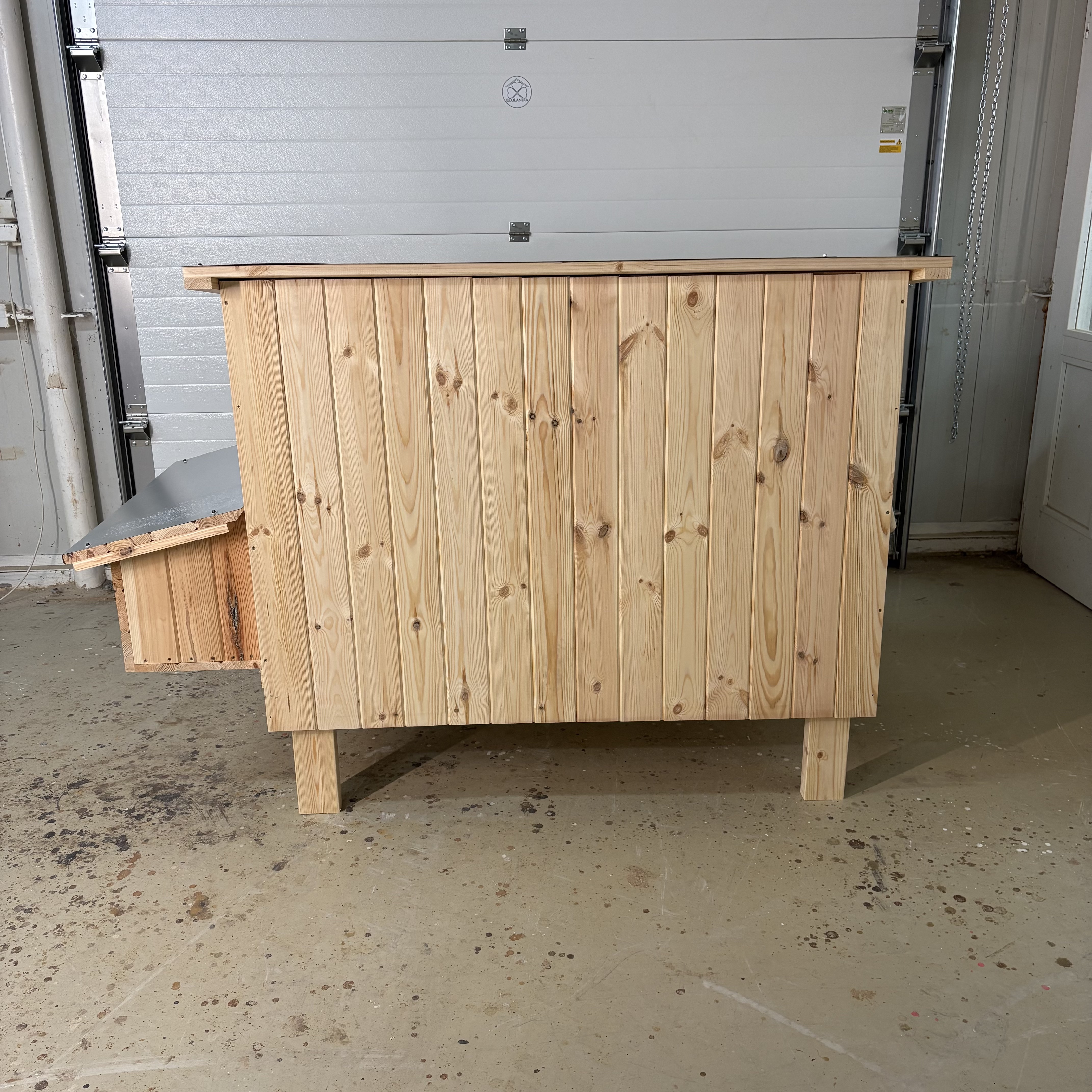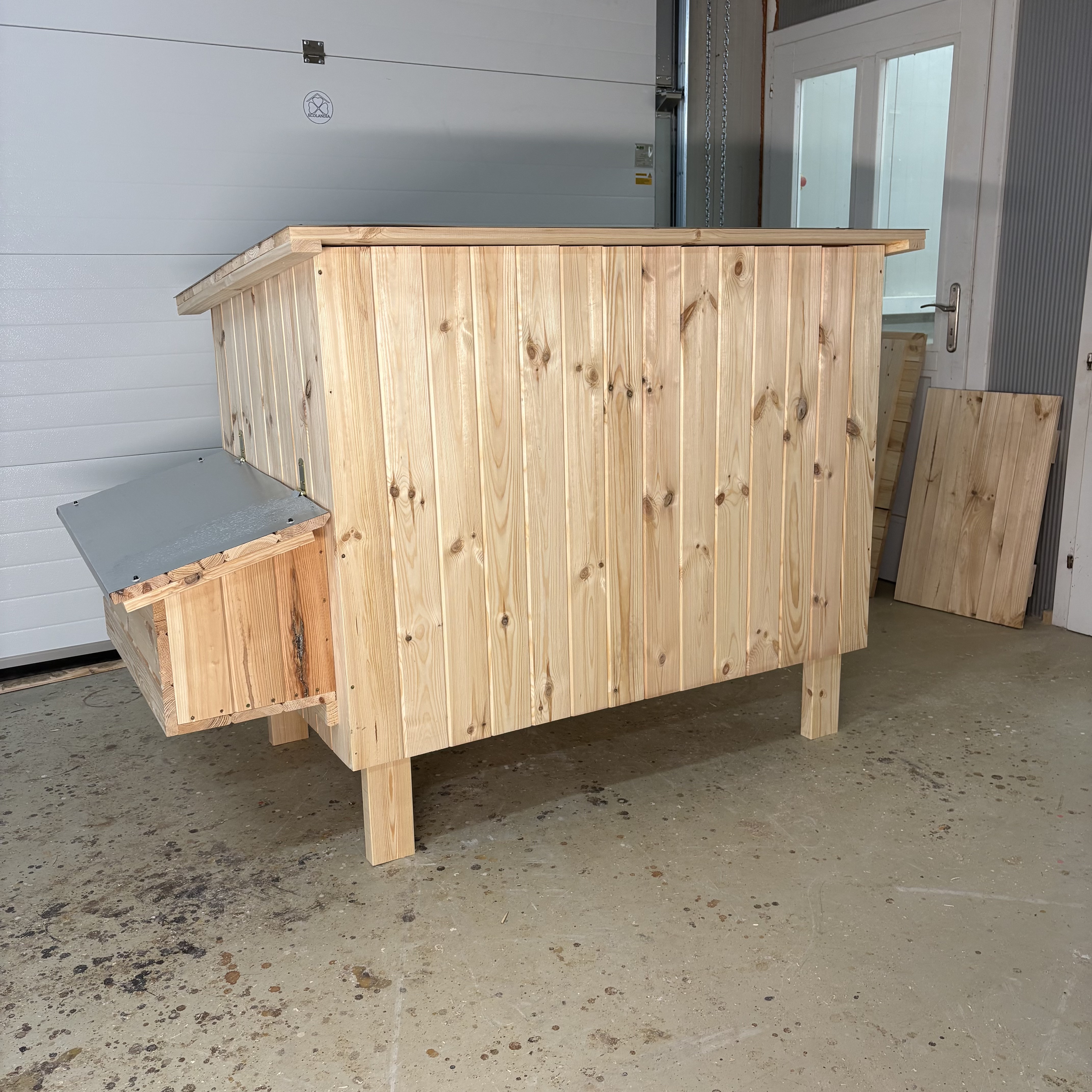 Na jeho výrobu je použito velmi kvalitní a odolné borovicové dřevo, které díky tloušťce masivu až 20/22 mm a preciznímu zpracování zaručuje, že do kurníku nefouká a odolá i silným mrazům či letním vedrům.