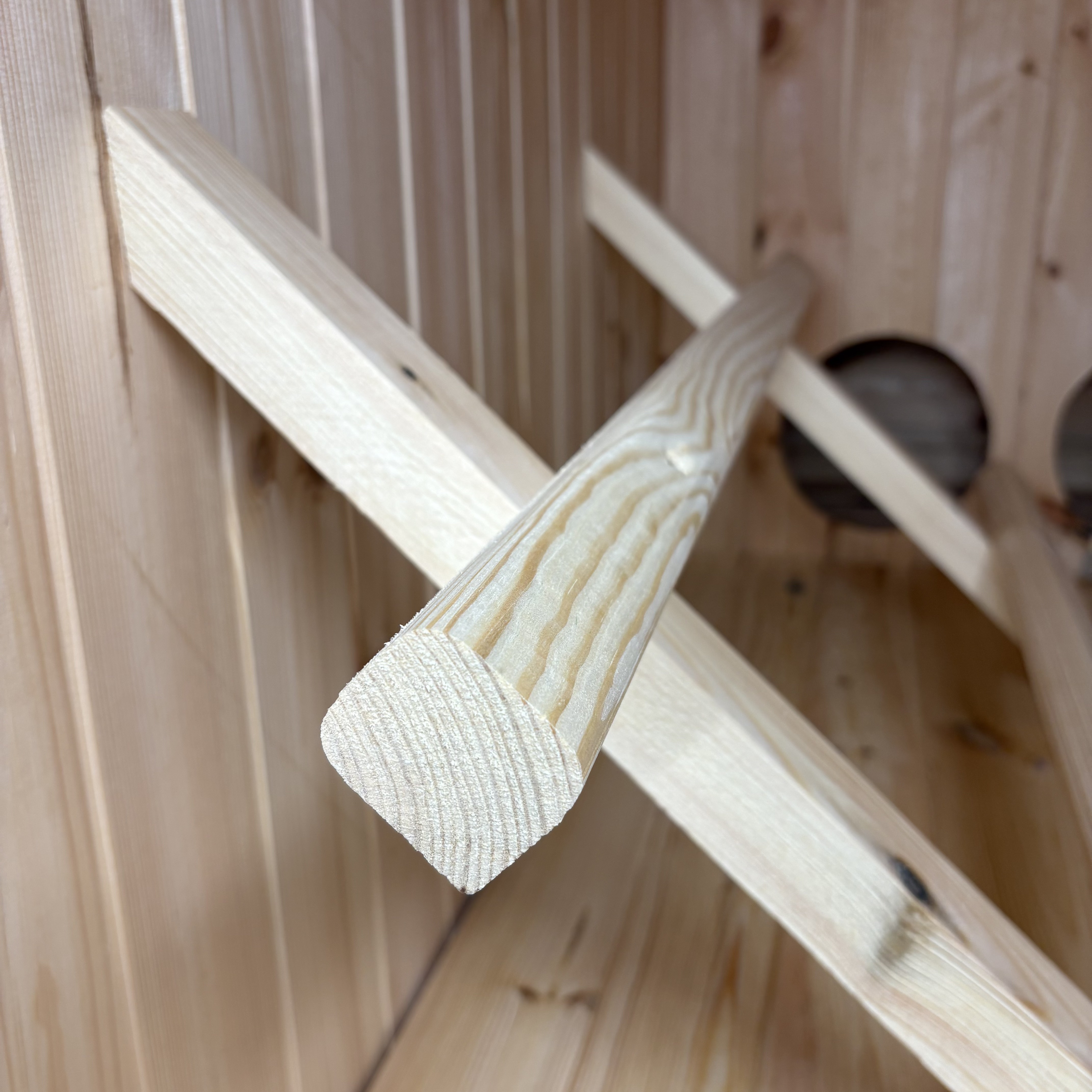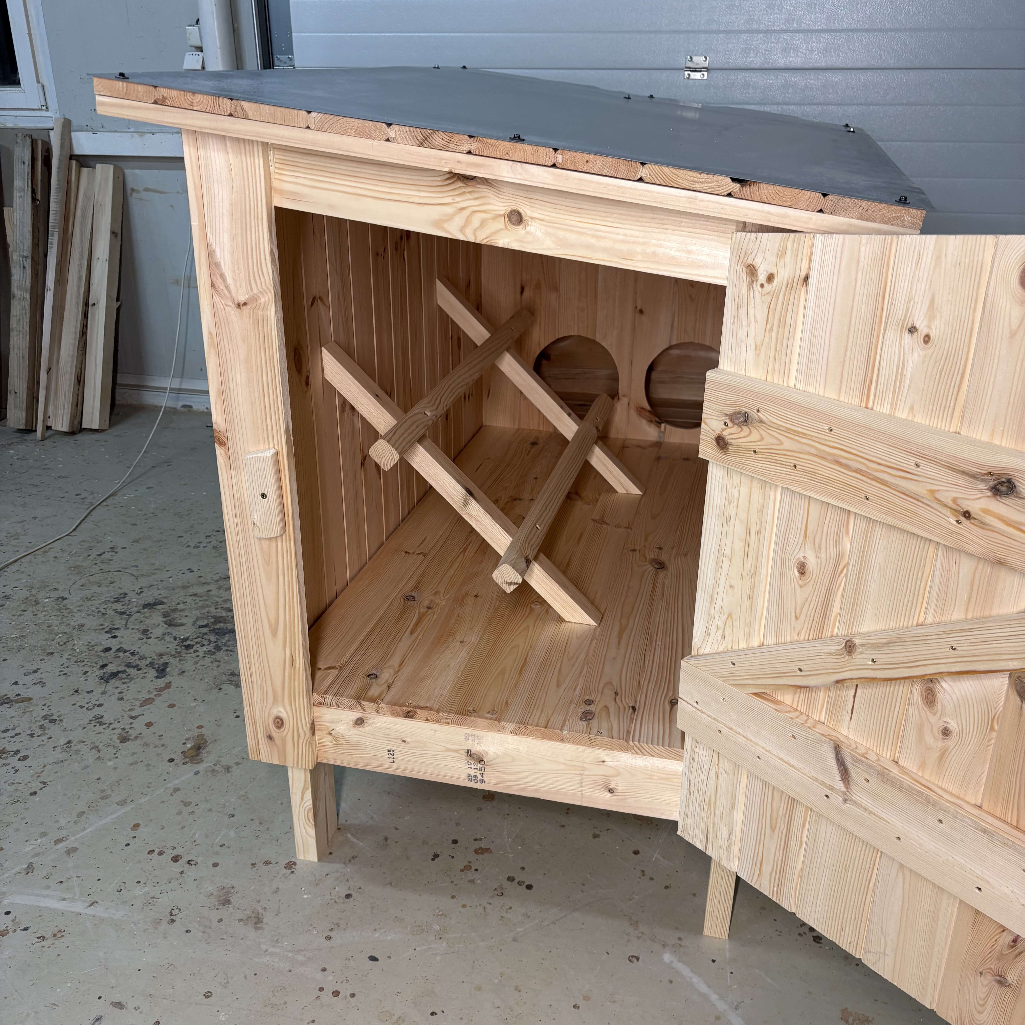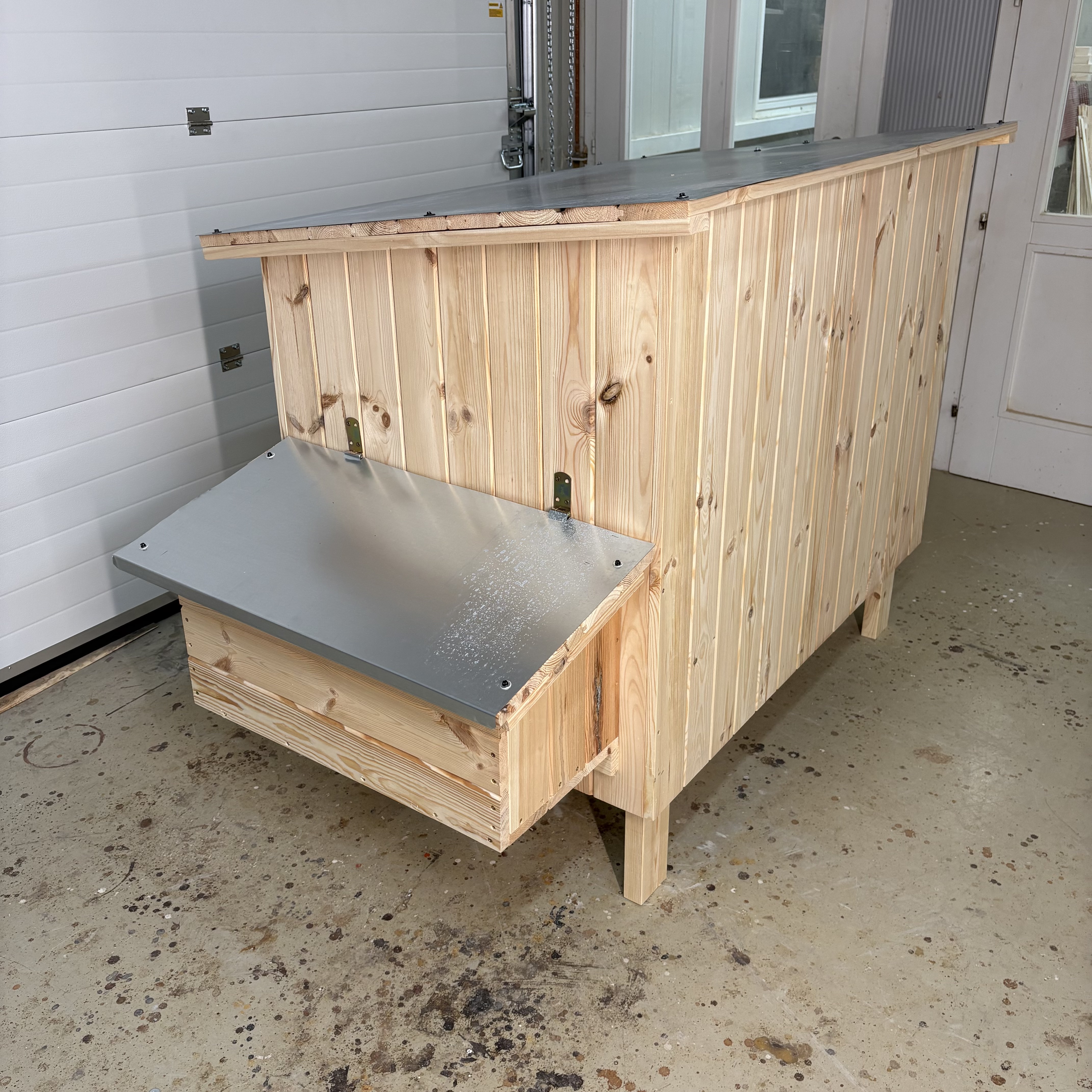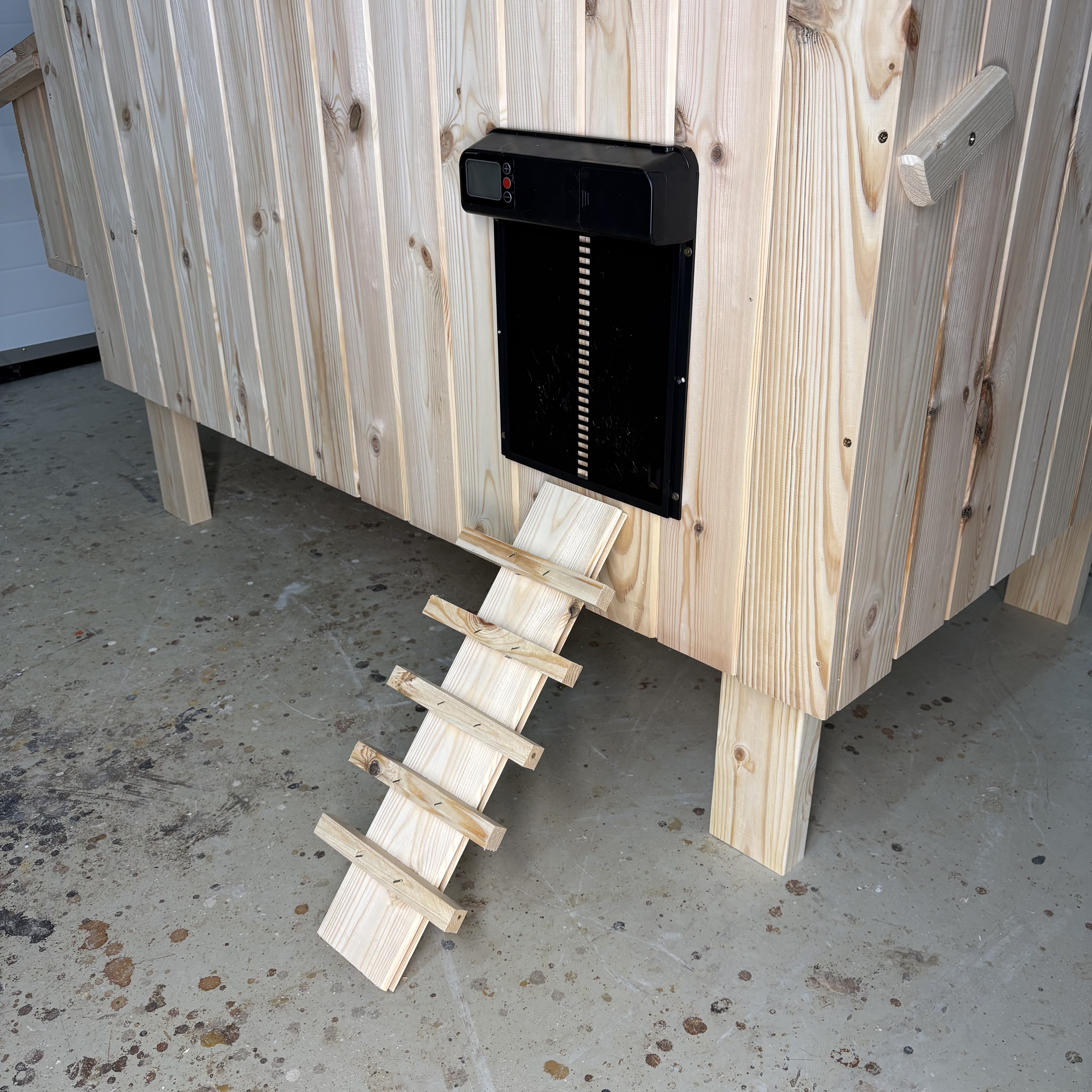 Na jeho výrobu je použito velmi kvalitní a odolné borovicové dřevo, které díky tloušťce masivu až 20/22 mm a preciznímu zpracování zaručuje, že do kurníku nefouká a odolá i silným mrazům či letním vedrům.