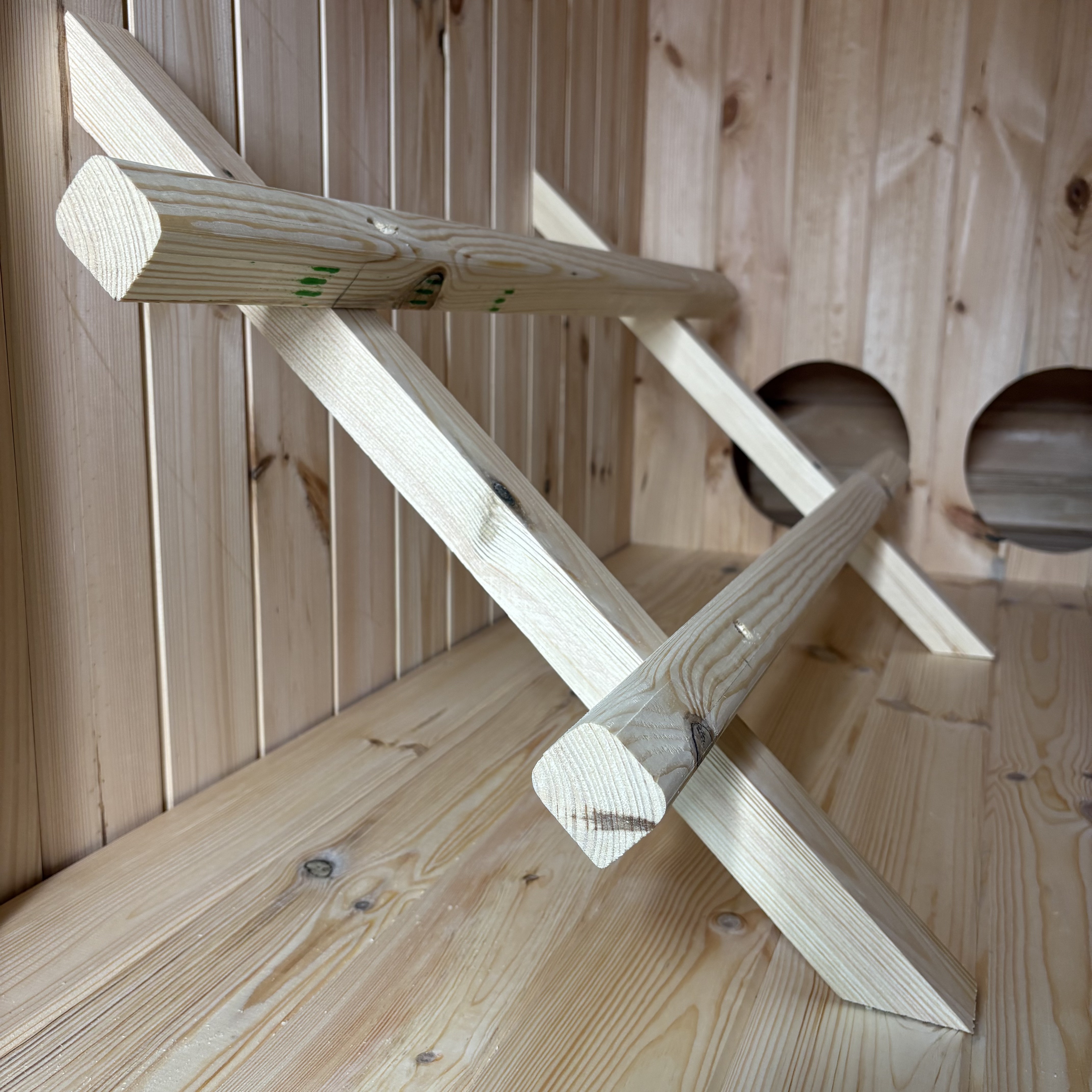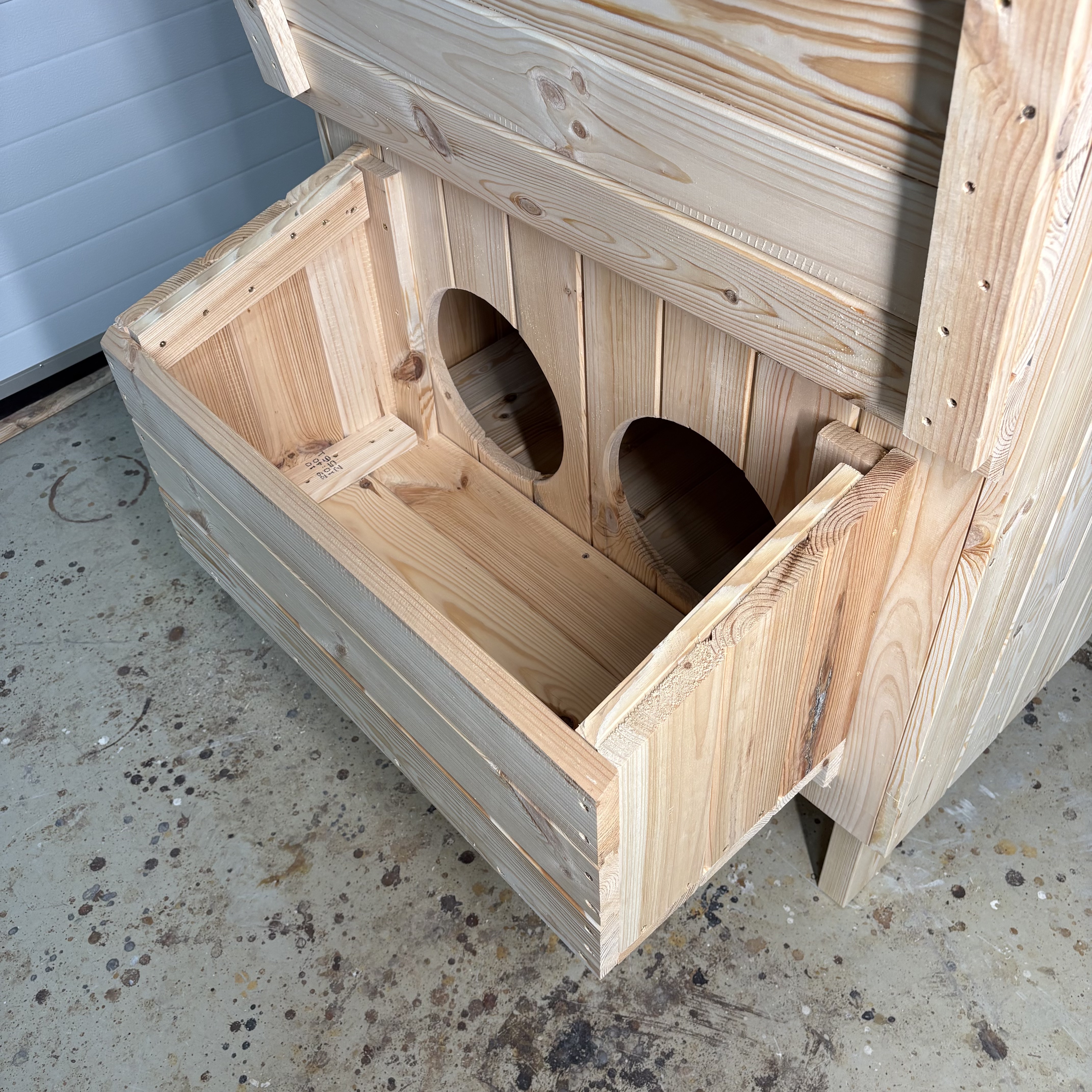 Vybavení: 2× vnitřní otvor do snáškového hnízda, vyvýšený spánkový rošt (bidlo), přístupová rampa.